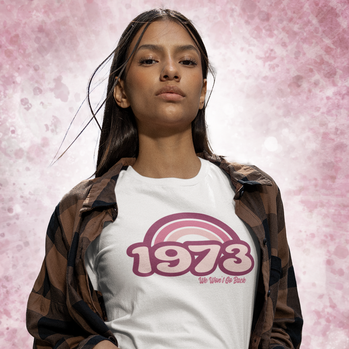 Retro feminist fashion features a vintage pink rainbow in distressed, throwback 70s typography reading: 1973, We Won't Go Back! Defend women's reproductive rights to choose.